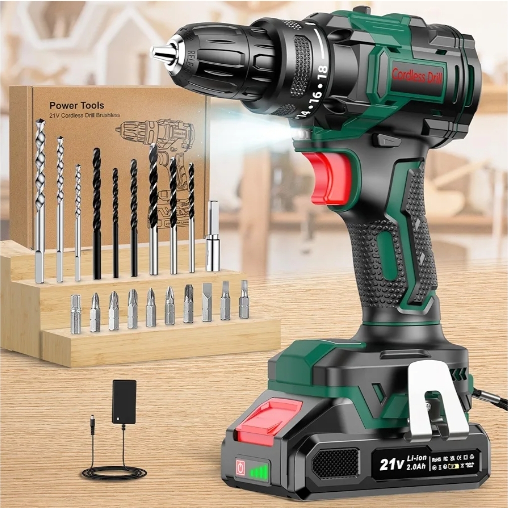 Upgrade Your DIY Game with Our Cordless Brushless Drill! 🛠️Take on any home or garden project with ease using our 21V Cordless Brushless Electric Drill. Designed for power, precision, and convenience, this drill is your ultimate DIY companion.Key Features:Brushless Motor: More efficient, longer-lasting, and quieter than traditional drills.Powerful Battery: 21V with 2000mAh capacity for extended use.Adjustable Torque: 18+1 settings with 42N·m max power for tackling any task.LED Light: Illuminates dark corners for accurate drilling.2-Speed Gear: Switch between high and low speeds depending on your project.Versatile Set: Comes with 20PCS drill bits, perfect for wood, metal, and plastic.