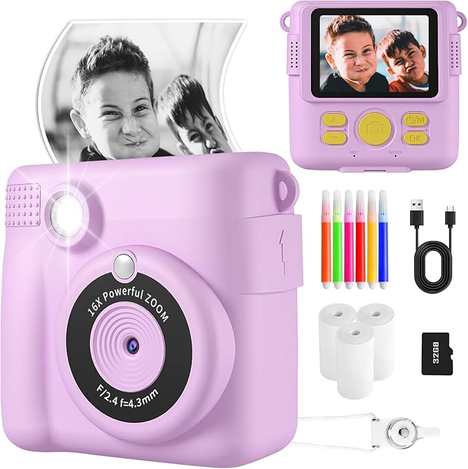 🎁 Instant Print Kids Camera – The Perfect Gift for Little Photographers! 📸✨Let your kids capture their favorite moments instantly with this 1080P HD Instant Print Camera! Designed for boys and girls aged 6–12, this fun and creative camera allows kids to take photos, record videos, and print pictures in seconds – no ink needed!💡 Features:✅ Instant black & white photo printing – just snap & print!✅ 1080P HD video recording for vivid memories✅ Comes with 3 rolls of photo paper & color pens for fun decorating✅ 32GB SD card included – store thousands of photos✅ Lightweight & easy to use – perfect for little hands🎨 Encourage creativity and imagination with this adorable kids’ camera. A perfect birthday or Christmas gift that combines fun, learning, and technology! 🎅📷