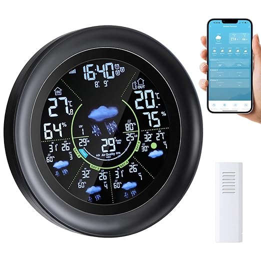 🌦️ Smart WiFi Weather Station – Stay Ahead of Every Forecast! 🌤️Get real-time, accurate weather updates right at home with this WiFi Weather Station with Outdoor Sensor — your ultimate personal weather assistant for the UK climate! 🇬🇧✅ All-in-One Monitoring: Temperature, humidity, air pressure, rainfall, UV index, PM2.5, and AQI – all displayed clearly on the large color screen.🌅 Smart Forecasting: Enjoy 5-day weather forecasts with sunrise and sunset times so you can plan your days perfectly.📡 Wireless Outdoor Sensor: Monitors conditions outside and transmits data seamlessly to your indoor station.⏰ Multi-Function Display: Includes date, time, and 3 customizable alarms for your daily routine.📲 WiFi Connectivity: Sync data with your phone or online weather services for instant updates anytime, anywhere.