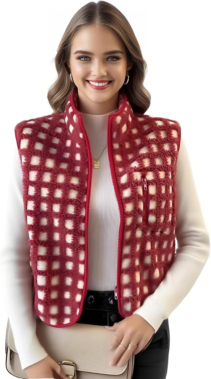 🧥❄️ Women’s Checkered Sherpa Fleece Vest ❄️🧥Stay cozy, stylish, and warm this winter with the Women’s Checkered Sherpa Fleece Vest! 💖 This sleeveless zip-up cardigan features a soft fleece design and high collar to keep you snug during chilly autumn and winter days. 🍂✨ Features:Trendy checkered pattern for a chic winter look 🖤🤍Ultra-soft Sherpa fleece for maximum comfortZip-up closure and high collar for extra warmthPerfect for layering over sweaters or long sleevesIdeal for casual outings, walks, or cozy days at home